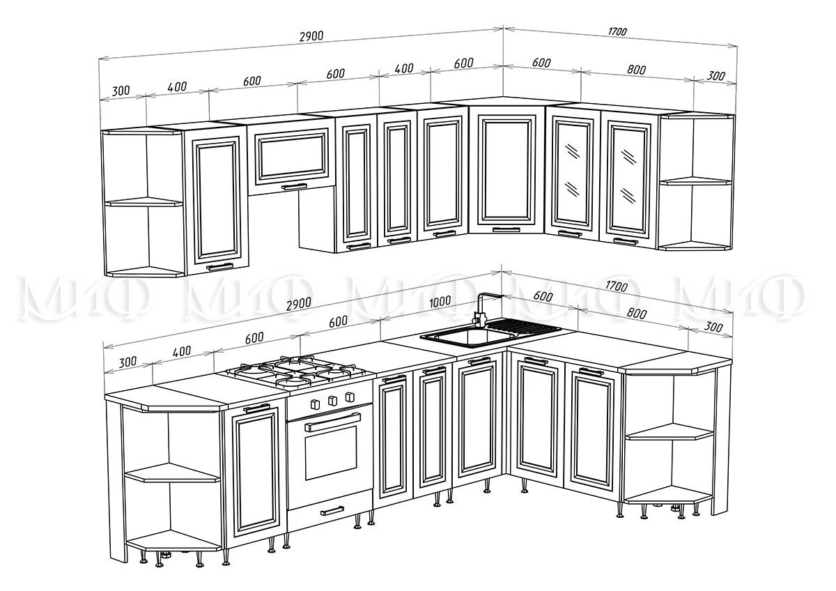 • Глубина шкафов: Верхние 300 мм/Нижние 600 мм/Глубина столешницы 600 мм